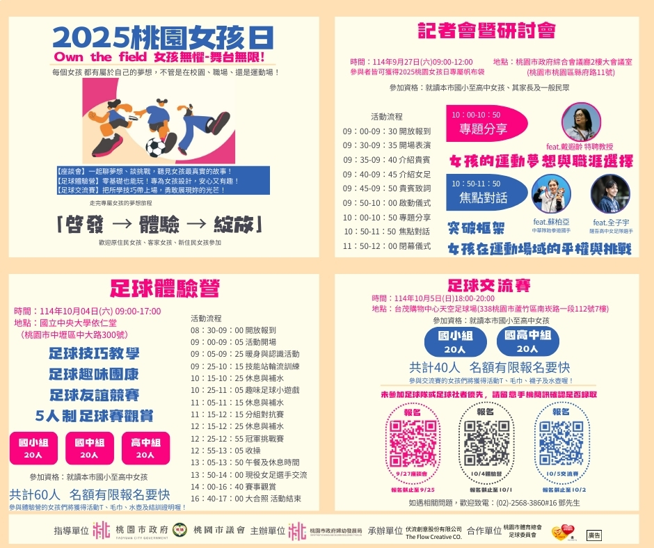 一、 | 為響應聯合國訂定10月11日為「女孩日」重視女孩投資與培力精神,今(114)年本局將延續深受好評的「運動性別平權」主軸,鼓勵嘗試更多元的運動項目,強化社會對女孩培力之認識與支持,並促進其健康發展與自信展現,辦理活動如下: |