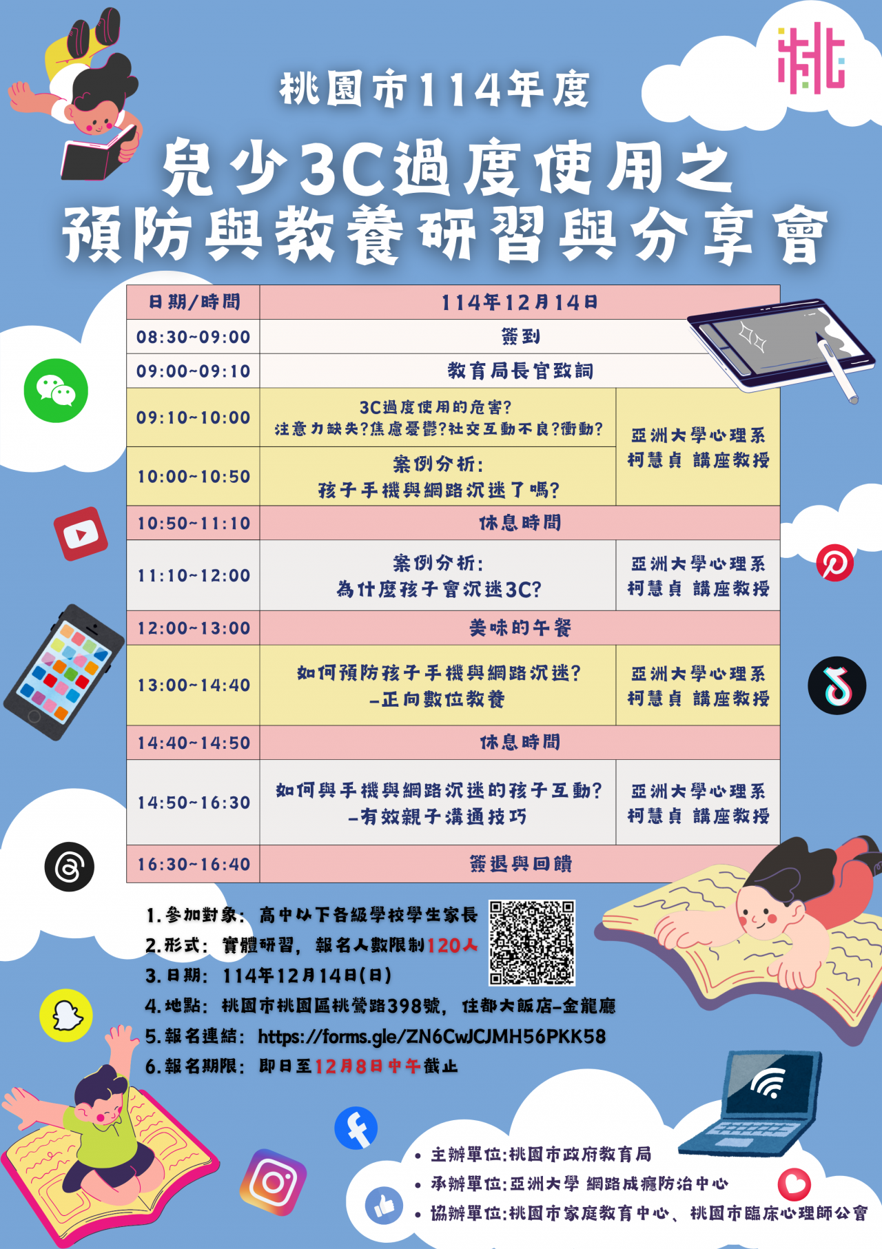 二、 隨著科技融入生活,過度使用3C可能影響孩子的身心發展、專注力、人際互動及作息品質。為協助家長更全面了解3C使用對孩子的影響,並掌握有效的家庭教養策略,114年度本局與亞洲大學合作辦理旨揭分享會,透過案例分析與互動交流,找到更適合自己孩子的教養方式。